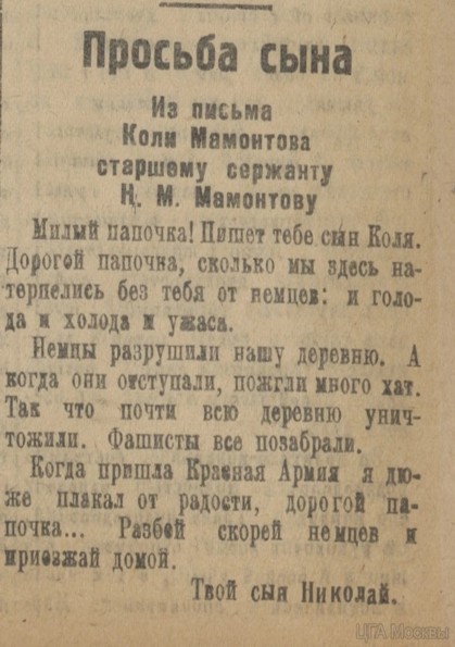 «Просьба сына. Из письма Коли Мамонтова старшему сержанту Н.М. Мамонтову».