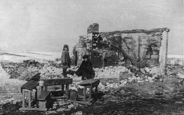 Дети у разрушенной школы в д. Машкино Суджанского района Курской области. Март 1943 г.