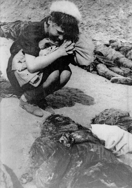 Мальчик плачет, глядя на свой горящий дом. Автор съемки А. А. Михайлов.