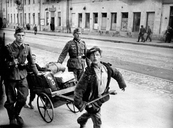 Русские дети на самодельных тачках везут багаж немецких солдат-отпускников на вокзал